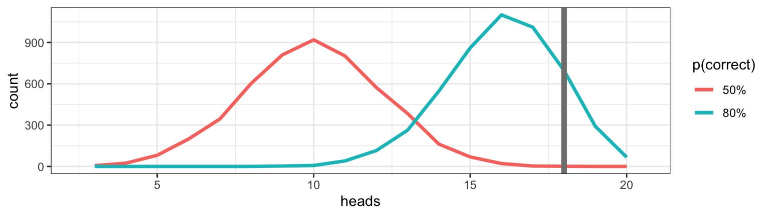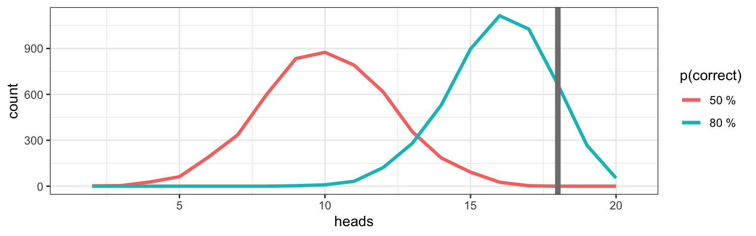 null = 0.5, alt = 0.8, n = 20, threshold = 18, reps = 5000)