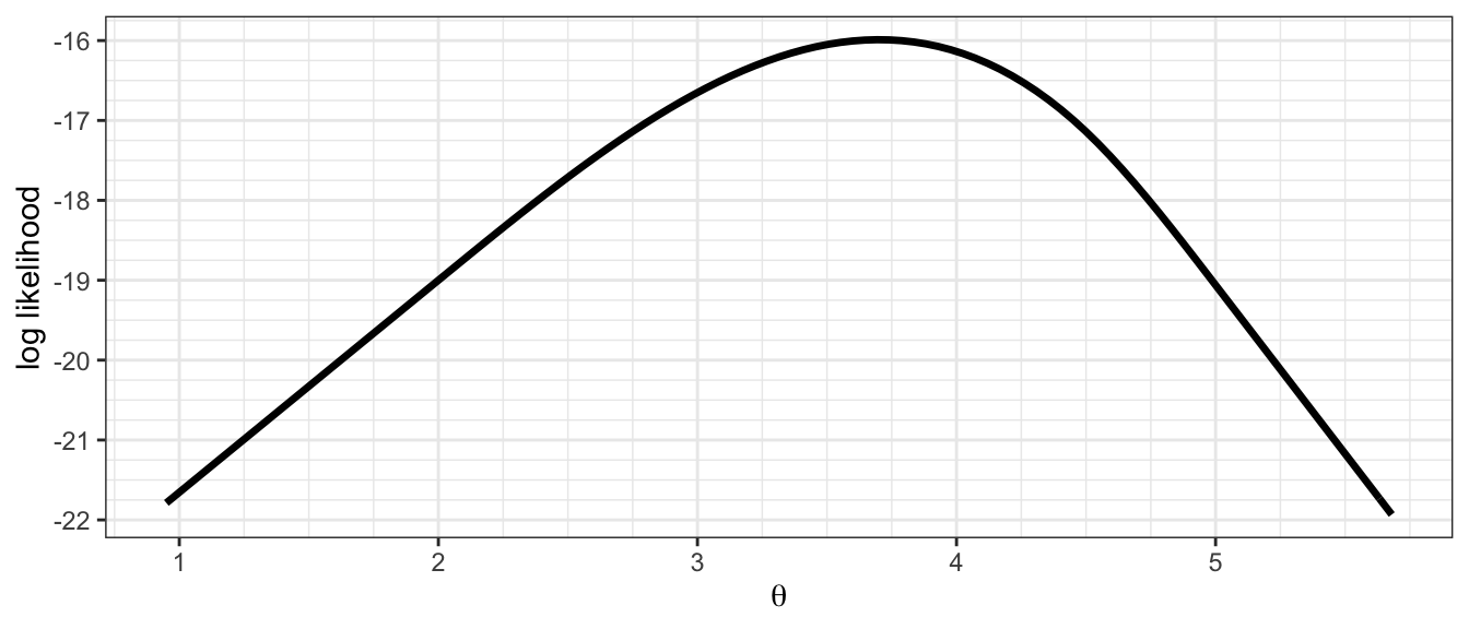 Below is a graph of a log likelihood function \(l(\theta)\) for a data set with \(n = 23\).